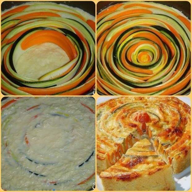 Готовим начинку. Очищаем морковь. Цукини и кабачок режем с кожурой тонкими полосками, так же поступаем с морковью (чтобы полоски были очень тонкими можно воспользоваться овощерезкой, а морковь можно настругать с помощью овощечистки). Полоски овощей должны быть одинаковыми по ширине, поэтому полоски кабачка и цукини нужно разрезать крупные пополам, а более мелкие подравнять.А теперь приступаем к выкладке овощей. Начинаем выкладывать овощи, начиная с края формы, постепенно двигаясь к центру, чередуя кабачок, цукини и морковь.