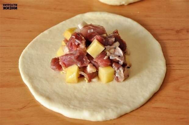 "Отдохнувшее" тесто ещё раз вымесить, и разделить на одинаковые кусочки, размером с небольшой мандарин, примерно 16-18 шт., кусочки раскатать в лепёшки, размером с блюдце, на середину положить начинку, и слепить пирожки в виде треугольников с дырочкой посередине. Эта дырочка нам нужна будет для того, чтобы залить туда бульон при выпекании.