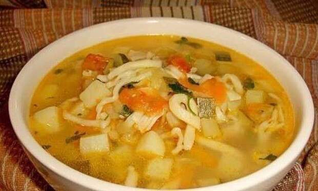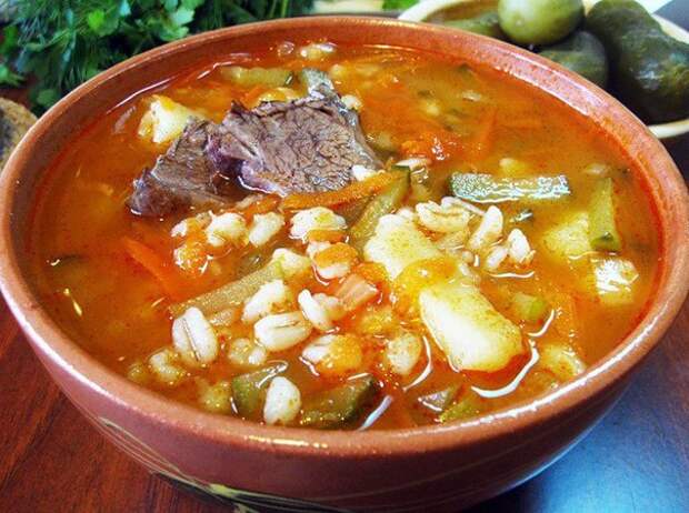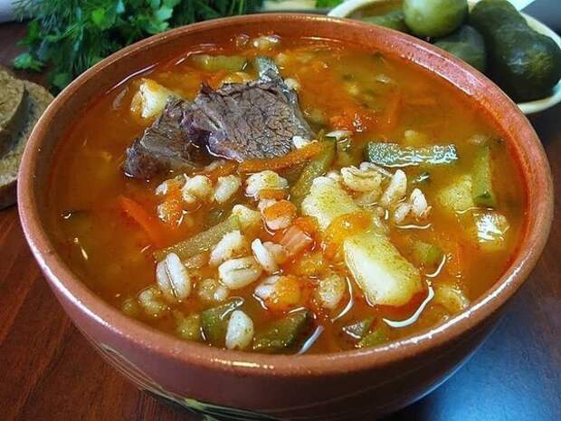 5. Через час положить поджаренные овощи, картофель, влить огуречный рассол, добавить специи. Продолжить варку до окончания программы.