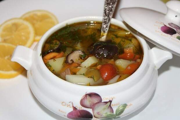 4. Добавить маслины, каперсы и варить еще 5 минут. Подавать солянку со сметаной и лимонным соком.