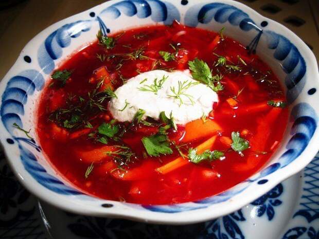 Через 10 минут положить нарезанную капусту и варить около 5 минут. В суп положить зажарку и варить еще несколько минут. Добавить перец, зелень и чеснок по вкусу. После приготовления нужно накрыть борщ крышкой и дать ему некоторое время настояться.