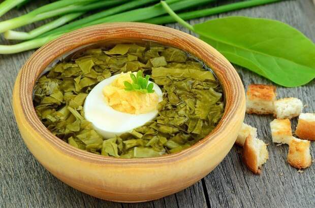 Нарежьте шпинат недлинными полосочками, добавьте в кастрюлю. Варите 5 минут.Щавель нарежьте так же, как шпинат, добавьте в борщ, дайте вскипеть и сразу снимайте с огня, чтобы щавель не разварился. Дайте настояться минут 15.Мелко нарезанную зелень петрушки и укропа можно добавлять вместе со щавелем или прямо в тарелки. Часть яиц нарежьте кубиками, часть – кружочками.Разлейте борщ по тарелкам, добавьте в каждую кусок мяса, яичный кружочек и посыпьте нарезанным яйцом. По желанию можно добавлять сметану.