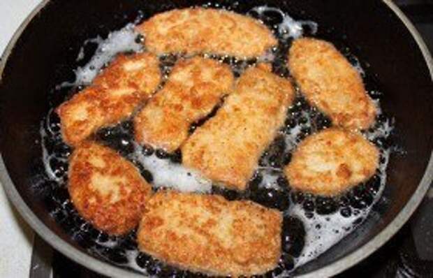 Слой растительного масла в 5-6 мм сначала перекаливаем на сковороде, включив сильный огонь. Когда оно перекипит, выкладываем на некотором расстоянии друг от друга наггетсы, жарим до хорошего подрумянивания одну и другую сторону котлеток.